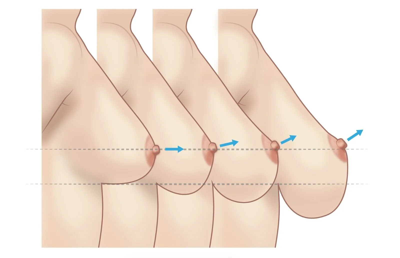 Circunstancias como cambios bruscos o amplios de peso, los embarazos, periodos de lactancia prolongados, o simplemente el paso del tiempo pueden hacer que la piel y los ligamentos de la mama se hagan más frágiles, no puedan sostener los pechos y tiendan a caer.